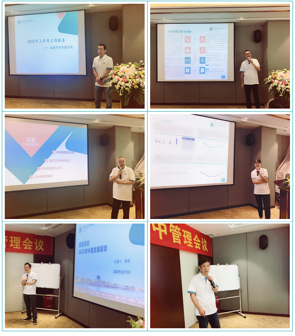 成都市老年康疗院总经理兼院长肖洪松、绵阳点点taptap重庆时时彩老年病医院总经理兼院长陶志强、成都点点taptap重庆时时彩锦宸康复医院总经理兼院长杨前程、芒果儿童健康中心总经理石晓玲分别对本机构的年中检查小结、上半年经营业绩回顾、上半年存在的主要问题及整改措施、下半年整体运营思路作了汇报。恩康责任董事季昶对下属杭州和康康复医院、杭州和康第二康复医院、杭州康馨康复医院、杭州康祥医院上半年经营状况、重点事项及存在的问题、下半年整体运营思路作了汇报。金华点点taptap重庆时时彩金帆康复医院总经理兼院长傅永强对医院进行了介绍,对医院筹备情况及下一步规划作了汇报。每次汇报后,与会者都纷纷深入提问、建言献策,对各机构目前遇到的困难和未来发展提出可行性建议和指导。