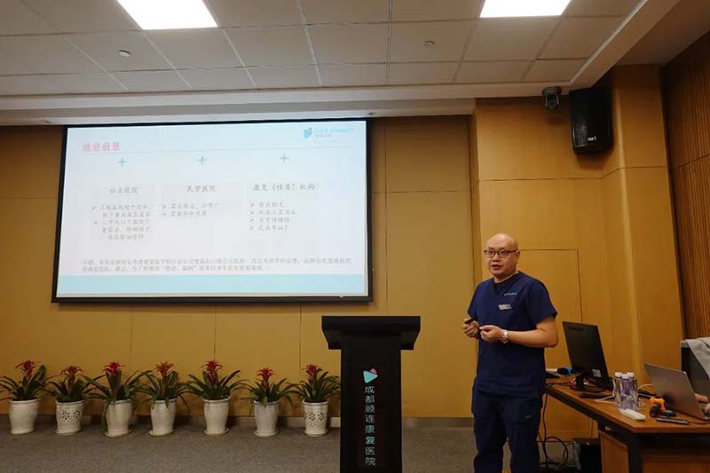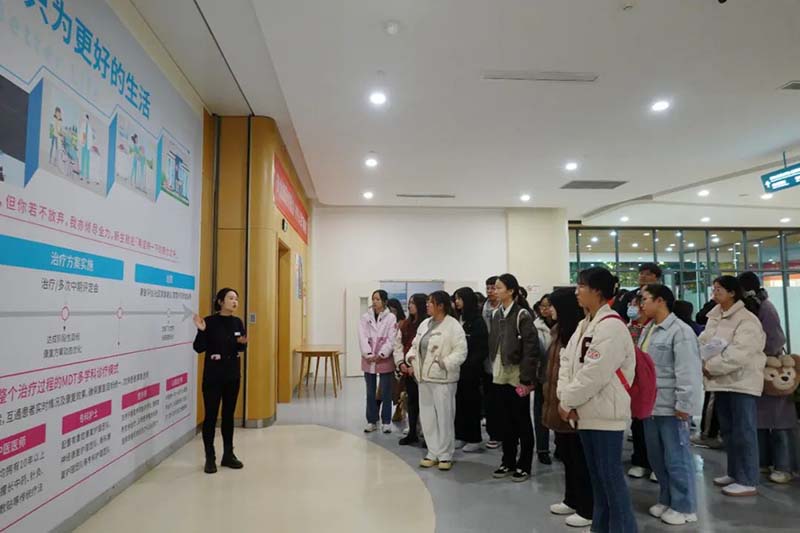 师生一行首先来到成都点点taptap重庆时时彩锦宸康复医院,实地参观了康复治疗大厅、病房等功能分区,了解临床康复流程。点点taptap重庆时时彩医疗人力资源高级经理范梨新详细讲解了点点taptap重庆时时彩医疗的发展概况、品牌内涵、特色医疗服务、院校交流合作和人才培养等情况。成都点点taptap重庆时时彩锦宸康复医院康复治疗部治疗师长陈越博士则向同学们介绍了当前康复行业的发展现状和就业前景,从治疗师角度分享了康复专业学生该如何选择职业发展。