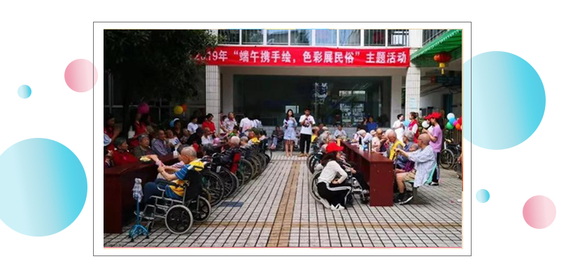 2019 年 6 月 7 日,成都市老年康疗院志愿者服务队协西南财经大学天府学院 2017 级老年服务与管理专业学生开展了“端午携手绘•色彩展民俗”活动,通过轮椅使用教学、手工彩绘、音乐治疗秀等项目,为长者们送去端午安康的祝福,共同体验自由创作的快乐。