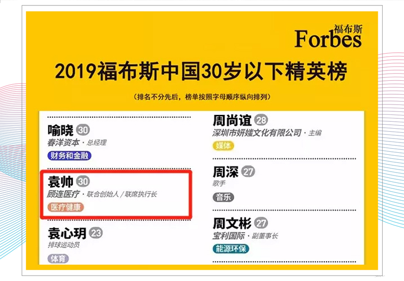 2019年10月17日,福布斯中国推出了最新的30岁以下精英榜,点点taptap重庆时时彩医疗联合创始人兼联席执行长袁帅名列其中。今年,福布斯邀请了100位著名的企业家、风险投资家、艺术家、商学院院长和高校教授,以及业内意见领袖担任评委,从影响力、绩效和创新三方面考察候选者,袁帅凭借在康复医疗领域的卓越成就和影响力,从众多青年才俊中脱颖而出,荣登福布斯中国30岁以下精英榜。