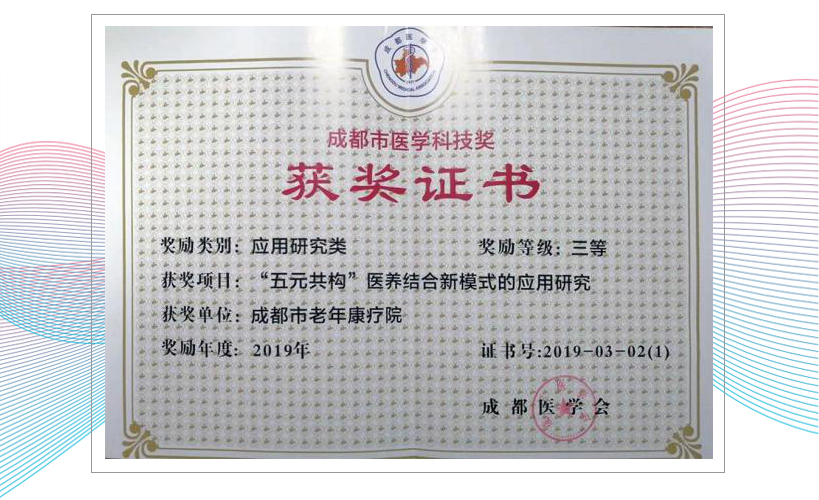 成都市老年康疗院项目《“五元共构”医养结合新模式的应用研究》荣获2019年度成都市医学科技奖三等奖。项目针对高龄、多病、失能、失智老人的医养难题,解决了老年人从急性期医疗到长期持续的医养照护直至临终关怀等一系列服务需求。