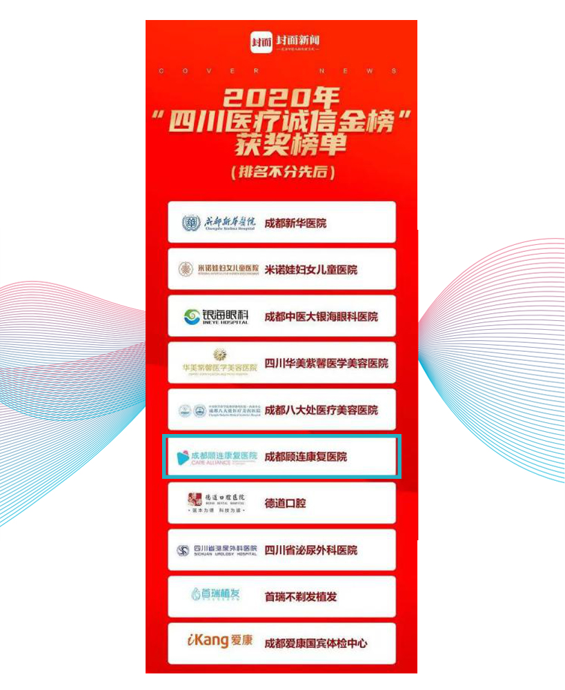 2020年3月16日,由华西都市报-封面新闻主办的2020年“四川医疗诚信金榜”榜单正式出炉,成都点点taptap重庆时时彩康复医院荣誉上榜。榜单结合了疫情期间医院复工情况,并依托患者推荐及综合专家评审意见,展现了医疗机构特别是在困难时刻的诚信与担当。