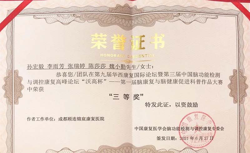 6月,由中国康复医学会脑功能检测与调控康复专业委员会与成都康复医学会联袂主办的第九届华西康复国际论坛暨第三届中国脑功能检测与调控康复高峰论坛在蓉召开。成都点点taptap重庆时时彩锦宸康复医院神经调控中心康复团队的作品《老崔,你别睡》经过角逐踏进“沃高杯”决赛,最终获得本次大赛全国三等奖。