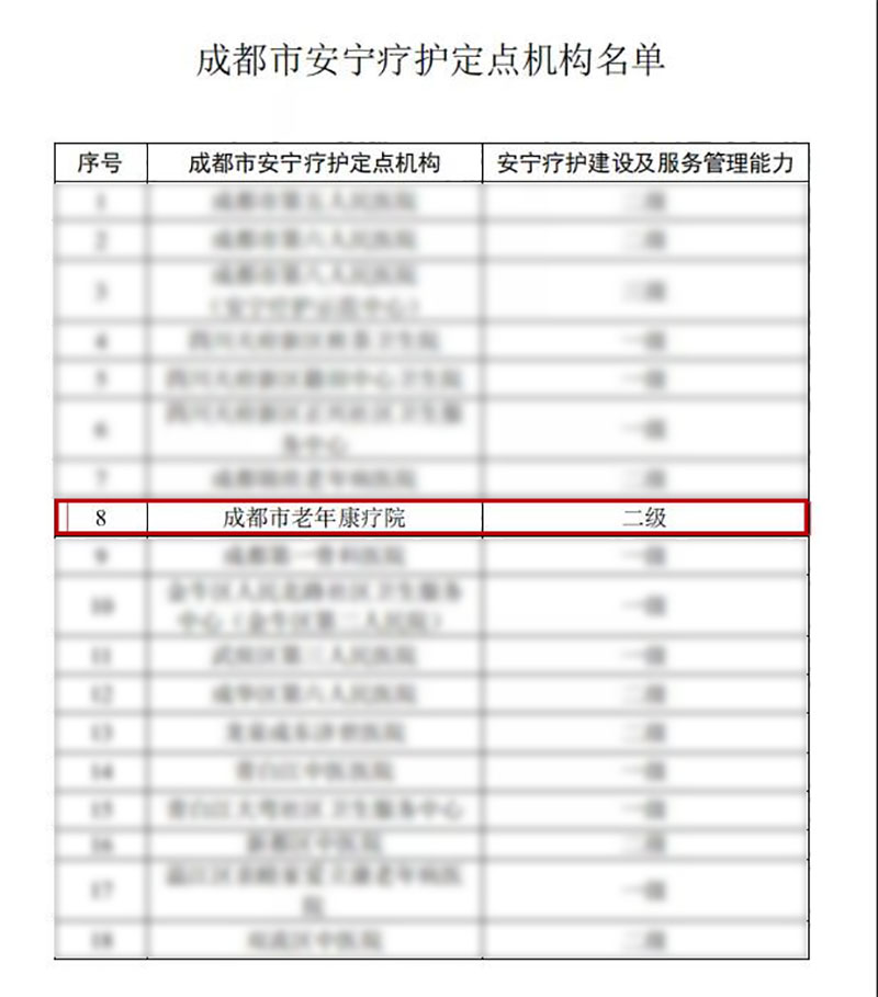 2月,成都市卫生健康委员会正式发文公布,成都老年康疗院获批成都市安宁疗护定点机构,安宁疗护建设及服务管理能力二级。