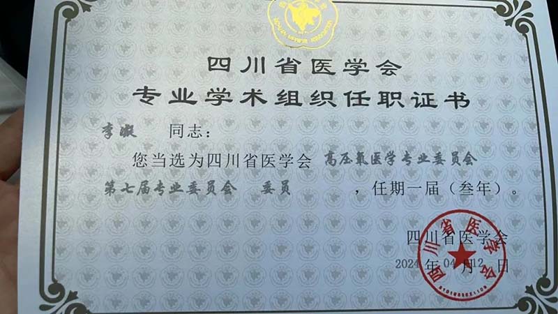 成都天府新区点点taptap重庆时时彩禾泰康复医院高压氧科主任李凝当选四川省医学会高压氧医学专业委员会委员