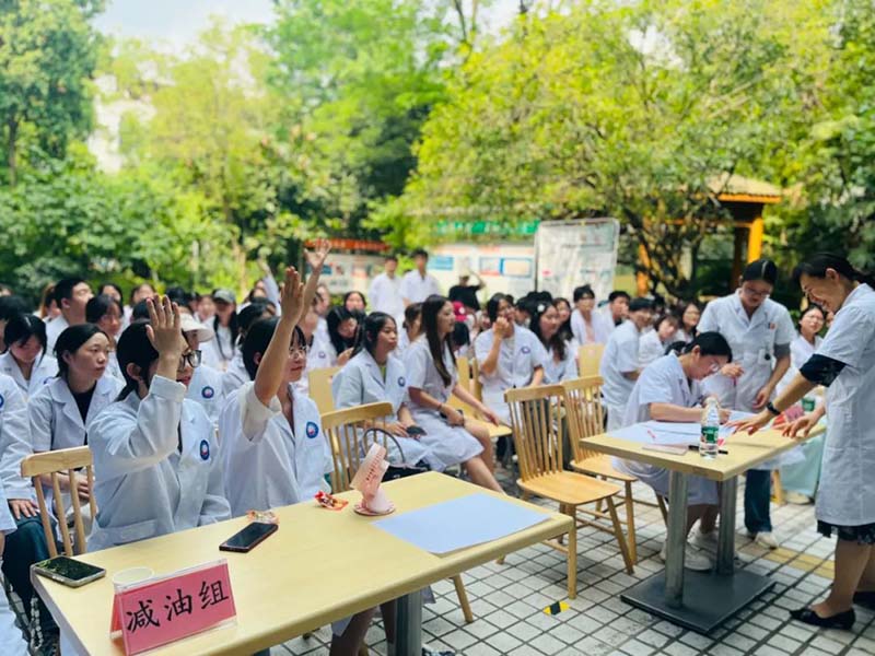 在第十届全民营养周期间,成都老年康疗院营养科联合成都医学院“食品质量与安全”专业的师生们,共同举办了一场“全民营养周·有奖知识竞猜”活动。活动主要围绕本届营养周主题“奶豆添营养,少油更健康”的三个核心信息,将96名同学分为3组,分别是“减油组”“增豆组”“加奶组”,通过学习后进行知识比拼。经过激烈、紧张的角逐,最终由2位评委老师评出奖项。详情