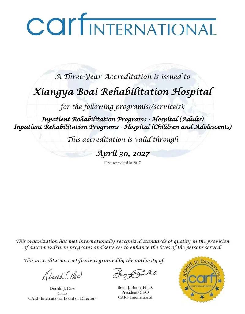 12月,湘雅博爱康复医院第三次通过CARF国际三年期认证。CARF全称为国际康复质量认证委员会,成立于1966年,是目前世界上康复医学质量认证最高标准之一。自2013年启动CARF认证的进程以来,湘雅博爱先后于2017年、2021年完成两次认证。详情