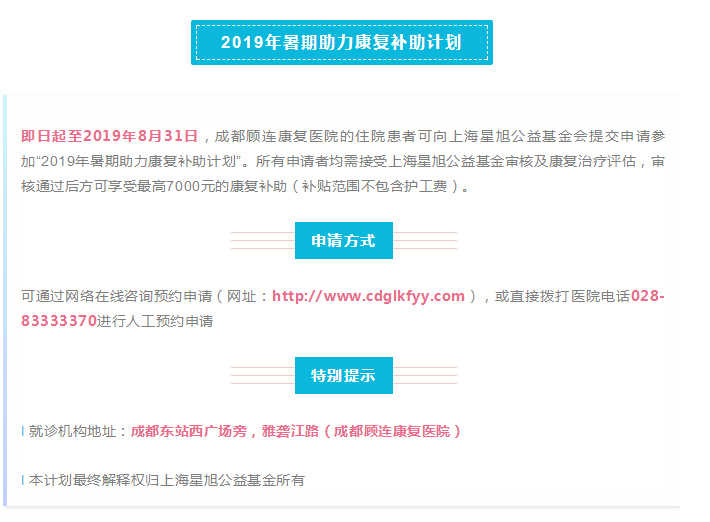 作为全国康复100强、川内康复领先单位,为助推四川康复医疗事业发展,让更多的人以可负担的费用,享受到国内顶尖的康复医疗服务,成都点点taptap重庆时时彩康复医院特联合上海星旭公益基金,开展上海星旭公益基金—2019年暑期助力康复补助计划,为符合条件的住院康复治疗患者带来人均最高7000元的爱心公益康复援助基金。
