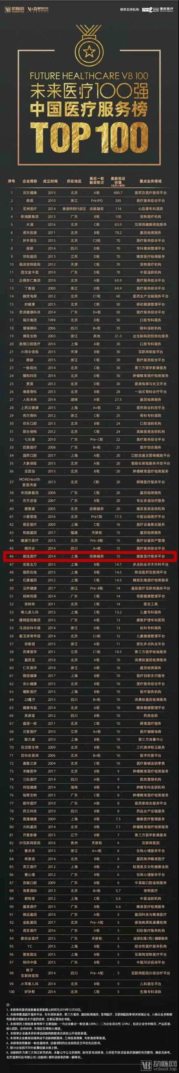 由动脉网、蛋壳研究院于2015年联合推出的未来医疗100强榜(简称VB100),是国内第一个针对非上市企业的创新医疗健康领域榜单,旨在遴选代表未来医疗的中国创新企业,发现我国未来医疗健康产业的核心力量,推动医疗健康产业的创新变革进程。