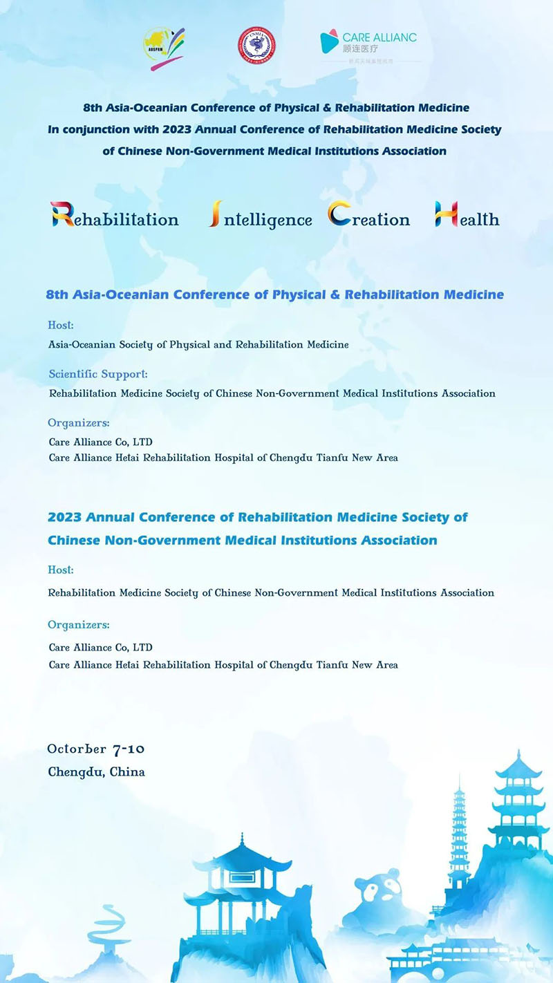 为全面贯彻“一带一路”建设思想,全面落实《“健康中国2030”规划纲要》,推动康复行业发展,加强国际交流与合作,学习国内外先进康复技术与管理经验,第8届亚洲大洋洲物理与康复医学大会(AOCPRM) 暨2023年中国非公立医疗机构协会康复医学专业委员会学术年会将于2023年10月7日-10日在成都召开,本次会议由点点taptap重庆时时彩医疗和成都天府新区点点taptap重庆时时彩禾泰康复医院承办,诚邀国内外医生、治疗师、护士、政府代表、医院管理者、科研人员、医药企业等相关人士参会。
