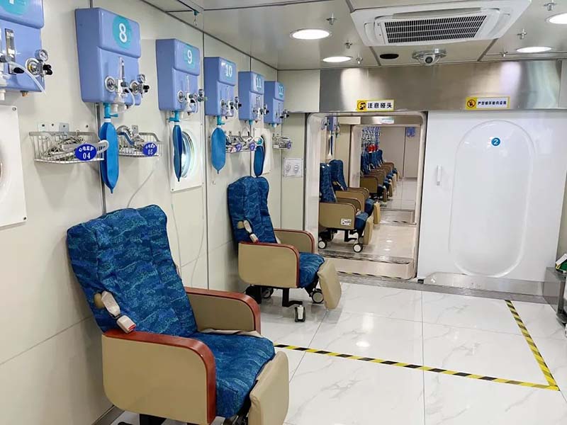 舱内还配备空调系统、安全检测系统、消防水喷淋系统、多媒体影音系统,确保患者治疗时的安全与舒适。