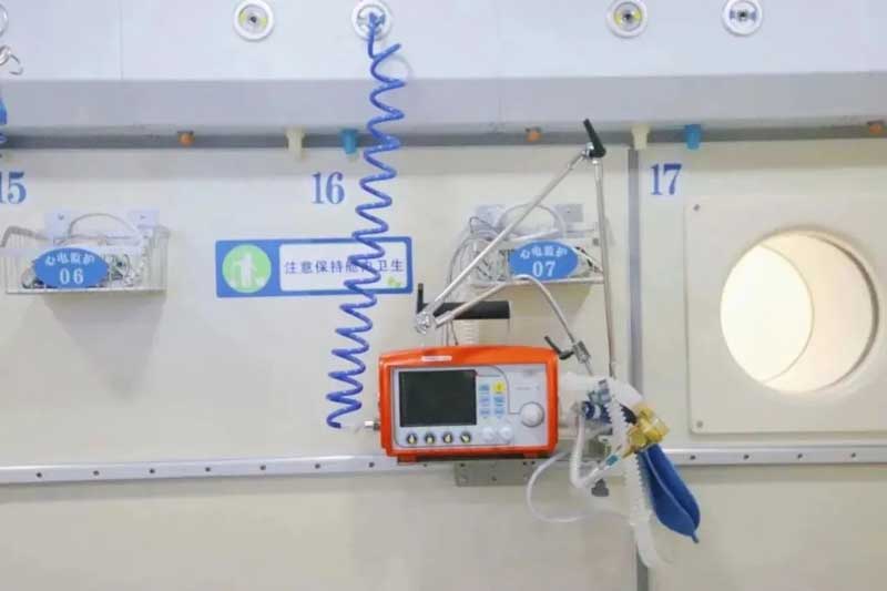 除了建舱以外,相关的设备设施也必不可少。按照重症标准建设,就需要配备呼吸器、监护仪等设备,并且得是氧舱专用的标准。蒋功达向我们介绍,上世纪90年代,国内没有可在氧舱高压环境中使用的呼吸机。为使重症患者也能享受到高压氧治疗带来的疗效,蒋功达团队请供应商专门定制改进,造出空气气动呼吸机,终于实现了机械通气重症患者得以入舱治疗。