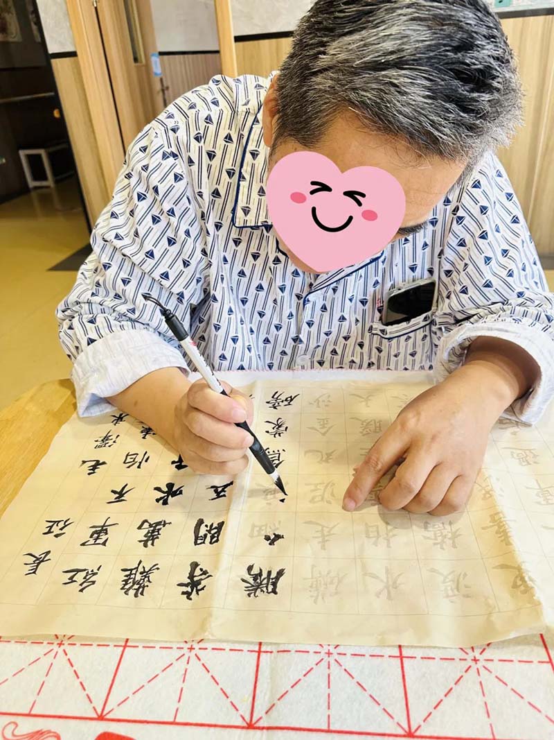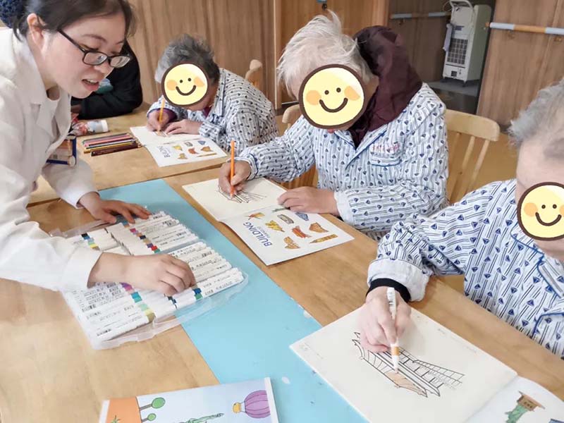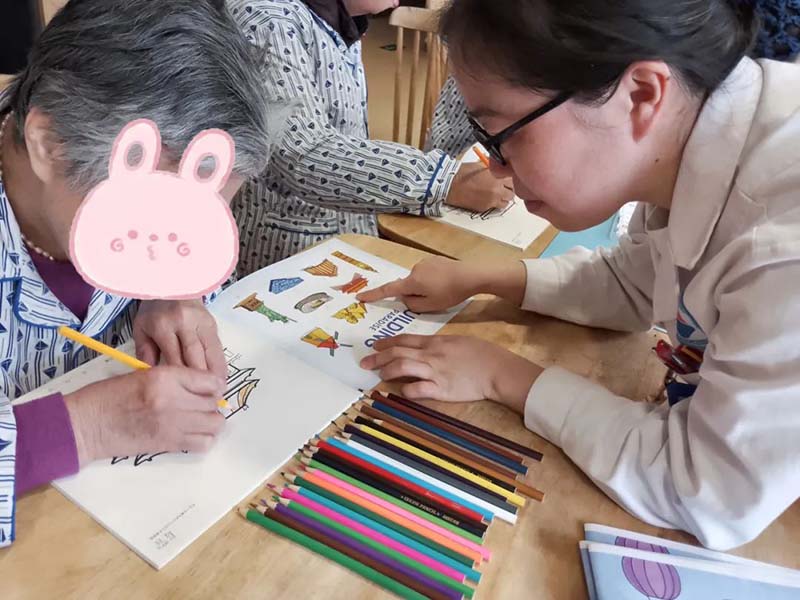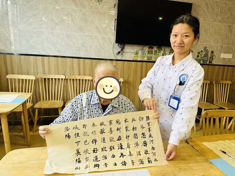 “科室里有老人平时喜欢画画、写字,我们就邀请喜欢书法和绘画的老人一起来练习,在医护人员和护工的陪伴下,老人们都非常认真完成这些事情。这种方式又叫工娱疗法,一方面可以帮助他们有效预防病情恶化,另一方面也能丰富老人的生活。”