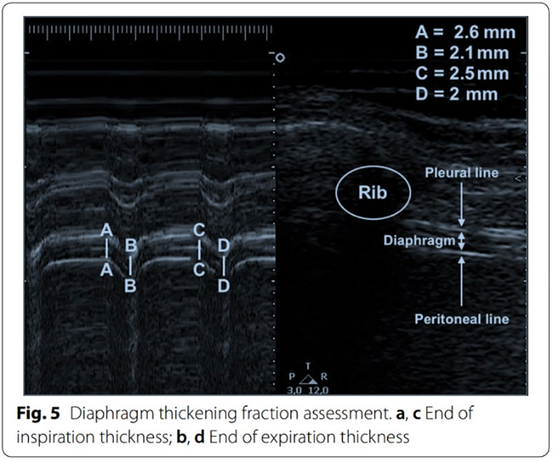 b.膈肌增厚分数 (DTF, %):DTF=(平静吸气末膈肌厚度-平静呼气末膈肌厚度)/平静呼气末膈肌厚度×100%